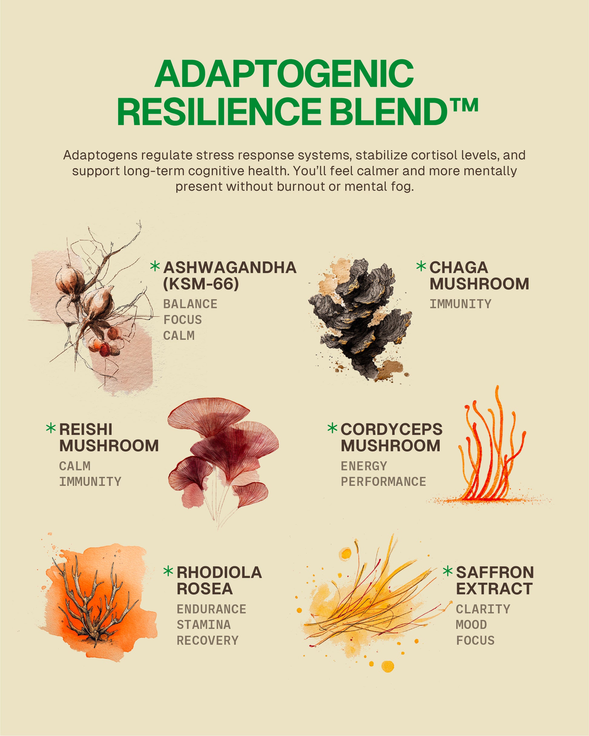 Adaptogens regulate stress response systems, stabilize cortisol levels, and support long-term cognitive health. You’ll feel calmer and more mentally present without burnout or mental fog.